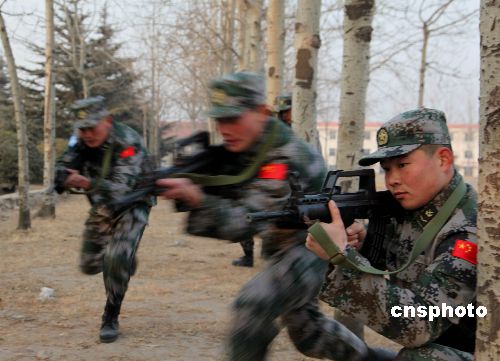 1月7日,济南军区第二批赴苏丹达尔富尔维和工程兵大队警卫中队的官兵进行出国前最后阶段的防卫训练。中新社发 毕华明 摄