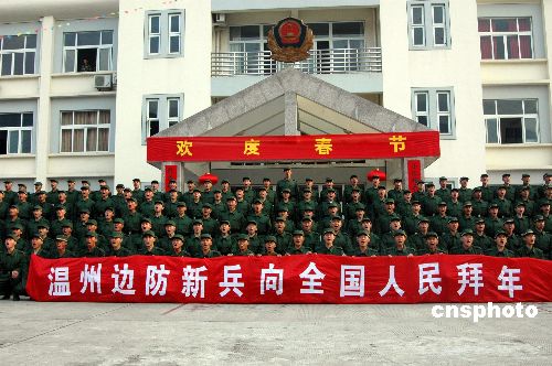 1月24日,驻守在东海之滨的浙江温州边防支队全体新战士在第二故乡向全国人民拜年,祝祖国繁荣昌盛,祝人民新春快乐!中新社发 吴水斌 摄