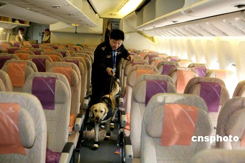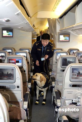 春节前夕,两条名叫“维特”和“泰格”的拉布拉多缉毒犬出现在T3航站楼一架来自阿联酋的飞机机舱内。这是中国缉毒犬在历史上首次登机检查。近年来北京空港口岸人体藏毒和行李夹层藏毒案件明显增多。为了进一步增加缉毒手段的主动性,提高口岸查毒的准确率,北京海关缉私局决定训练缉毒犬进行登机检查。海关缉毒人员对付跨国贩毒分子又多了一个杀手锏。中新社发 雷虹 摄