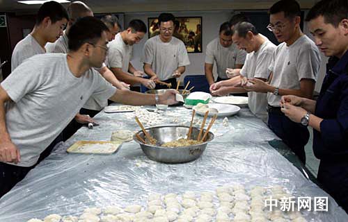 “海口”号导弹驱逐舰官兵包饺子过新年。中新社记者 孙自法 摄