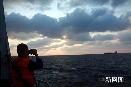 牛年正月初一,迎着亚丁湾海域新春第一缕朝霞,“海口”号导弹驱逐舰护航“丰盛海”号商船。中新社记者 孙自法 摄