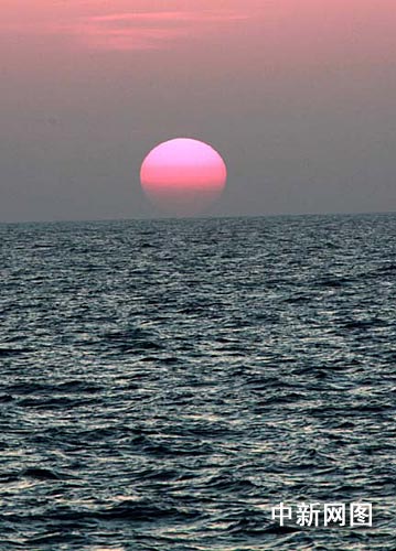 牛年正月初一,亚丁湾海上日落时一轮红日与海面相切时的绚丽景观。中新社记者 孙自法 摄