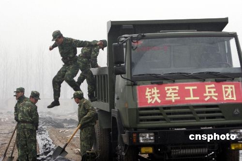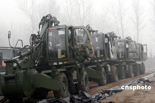 2月7日,铁军官兵在黄河岸边进行导流渠开挖施工前的准备工作。当日济南军区铁军工兵团200多名官兵携99台工程装备开进河南封丘黄河岸边,开始抢挖抗旱导流渠。这条导流渠长约2300米,约需5天时间开挖完毕。黄河水经此导流渠进入当地灌溉渠系,将对黄河以北的河南新乡市、安阳市等灌区的265万亩进行灌溉,以解大旱之急。中新社发 张晓理 摄