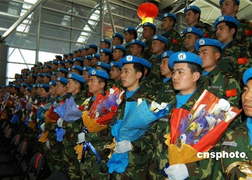 2月16日下午,中国第五批赴苏丹维和部队第一梯队出征仪式在河南省郑州市新郑国际机场举行。中国第五批赴苏丹维和部队共由375名官兵组成,包括一支工兵大队,一支运输大队和一支医疗分队。此次出征的第一梯队共105人,包括工兵大队40人,运输大队30人,医疗分队35人。他们将于当地时间17日10时左右到达苏丹欧拜伊德,随后转乘联合国包机飞赴瓦乌任务区。其余维和人员将于本月陆续抵达任务区。 中新社发 李亮 摄