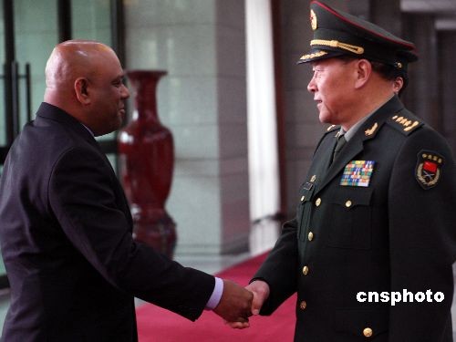 2月19日下午,国务委员兼国防部长梁光烈上将在北京八一大楼会见来访的马尔代夫国防与国家安全部长费萨尔一行。中新社发 宋吉河 摄