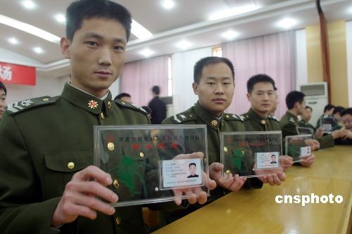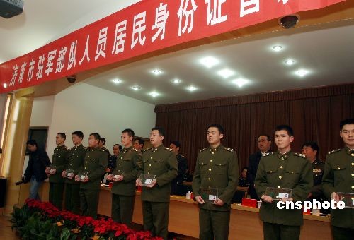 2009年2月26日,济南警备区、济南市公安局联合举行驻济部队现役军人居民身份证首发仪式。自此,济南市为驻济部队申领发放具名身份证工作正式启动。此举将对部队人员办理储蓄、保险、买车、购房等涉及个人权益事物时带来便捷。中新社发 龚辉 摄