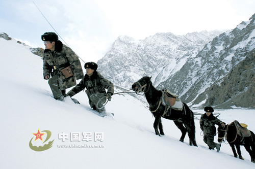 四月初,内地已是春暖花开,天山深处依然冰封雪裹。新疆军区某部科加尔特边防连官兵顶风冒雪坚持到点到位巡逻,维护边境安宁。朱生兴摄