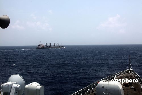 2009年4月11日,中国海军首批护航编队在亚丁湾开始执行第40批商船护航任务,“海口”号导弹驱逐舰单独伴随护航一艘晚到的香港商船“明达”号,从曼德海峡东口朝亚丁湾东部海域进发。当天早些时候,“武汉”舰已伴随护航5艘商船先行。中新社发 孙自法 摄