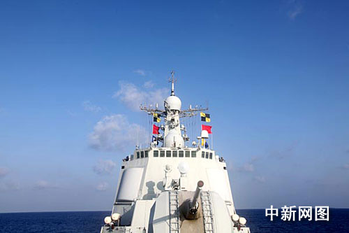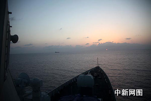 当地时间四月十三日清晨六时许,刚刚完成第四十批次七艘中外商船护航任务的中国海军首批护航编队,与前来接替执行护航任务的第二批护航编队,在亚丁湾东部预定海域顺利会合。“海口”号导弹驱逐舰高高升挂起彩旗,欢迎海军第二批护航编队的到来。中新社记者 孙自法 摄