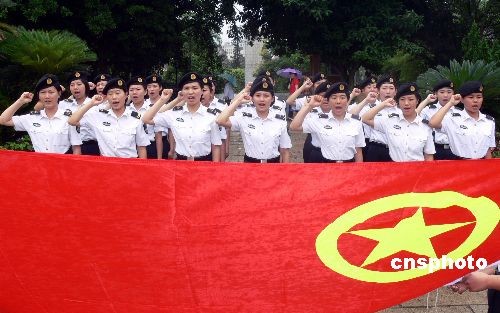 2009年4月29日,南海舰队航空兵某部女兵中队团员青年来到海口公园冯白驹将军雕像前举行入团宣誓活动。“五四”青年节临近,驻琼官兵纷纷来到爱国主义教育基地,开展各种活动,弘扬“五四”民族精神,激发青年官兵爱国主义热情。中新社发 邢利民 摄