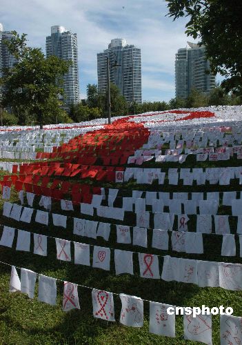 正在加拿大多伦多举行第十六届世界艾滋病大会内容丰富多彩,各国各地区的代表分别用自己独特的形式表达抗击艾滋病的决心。图为多伦多市预防艾滋病团体在大会会场外用近万画有预防艾滋病图案的小旗组成一个巨大的红丝带,以警示世人。中新社发 曾利明 摄
