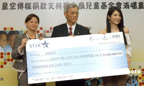 8月21日,联合国儿童基金会在香港特别举行记者会,联合国儿童基金会香港委员会主席冯庆彪(中)、基金会香港委员会大使杨釆妮(右)接受星空传媒代表捐款八百六十万港元,援助受南亚海啸的斯里兰卡、印尼灾区重建项目,主要协助当地受海啸破坏的学校,希望受影响的儿童能早日重返校园学习。中新社发 邓庆乐 摄