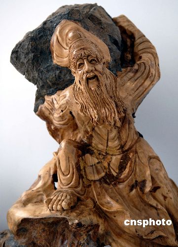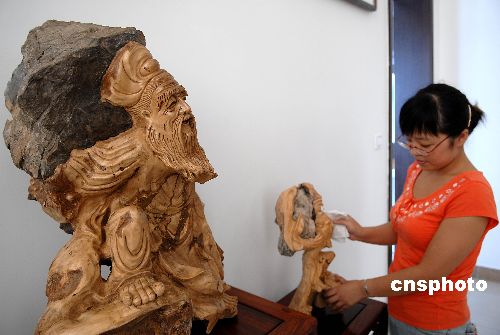 工作人员在整理附石根雕作品《愚公移山》。近日,山东省日照市日照当代美术馆收集了一组《愚公移山》根雕作品。这些根雕的原材料在生长过程中,把石头紧紧包在根中,形成了附石根。民间艺人充分利用它的特点和形态,创作出了“愚公移山”的生动造型。中新社发 陈为峰 摄