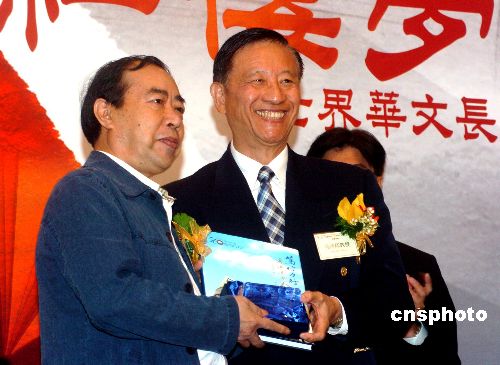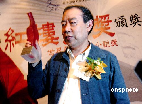 大陆著名作家贾平凹9月13日出席香港浸会大学文学院举行的第一届“红楼梦奖”:世界华文长篇小说奖》颁奖典礼,并从香港艺术发展局主席马逢国手中领取首届“红楼梦奖”。获得首奖的《秦腔》生动表现了中国社会历史转型给农村带来的价值观念和人际关系的震荡和变化。据介绍,由文学评论、杂志主编、作家组成的评审委员会接受了全球不同华文地区共二十九部高素质长篇小说提名奖,最后从七部入围作品中选出《秦腔》为首奖。中新社发 王丽南 摄