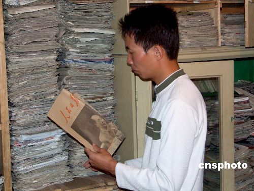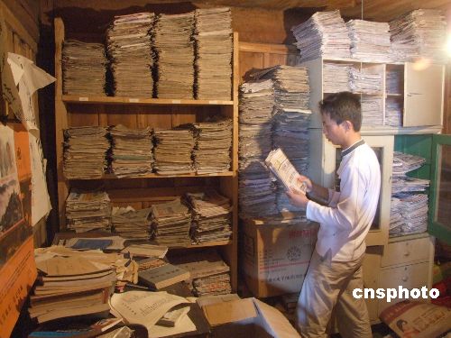 图为戴向阳在6平米堆满报纸的昏暗小房整理。江西婺源县赋春镇长溪村农民戴向阳居住在海拔1100米的深山,20年来坚持用集报丰富自己的山村生活,集报数量达3.2万份,8600余种。中新社发 王国红 摄