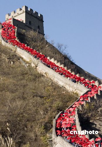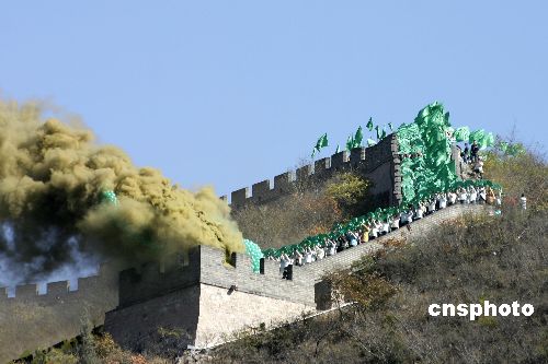 10月29日上午,5300名大学生志愿者分成红、蓝、黄、绿、黑五个方阵在长城上合作完成了大规模景观行为艺术“我们在长城上传递微笑”。中新社发 孙兆鹏 摄