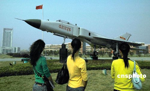 十一月一日,三名女大学生在校园观赏一架歼八原型机。被誉为“空中美男子”的这架歼八某型原型机日前从西安运抵南昌,落户南昌航空工业学院。该战斗机是由中国航空工业第一集团公司研制,委托中国飞行实验研究院捐赠给这所高校,用于航空教学,并营造航空文化,激励师生“航空报国,献身国防”事业。中新社发 段长征 摄