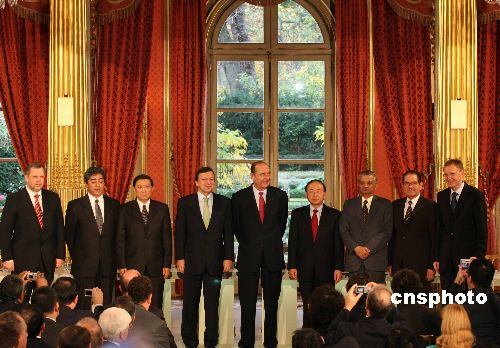 国际热核聚变实验堆(ITER)计划联合实施协定及相关文件正式签字仪式,11月21日在法国总统府爱丽舍宫举行。图为参加计划的各方代表在出席签字仪式后合影。中国科技部部长徐冠华(左三)率领中国代表团参加签字仪式并代表中国政府在协定上签字。出席签字仪式的还有法国总统希拉克(左五)、欧盟委员会主席巴罗佐(左四)以及印度、日本、韩国、俄罗斯和美国的代表。中新社发 钟诚 摄