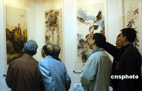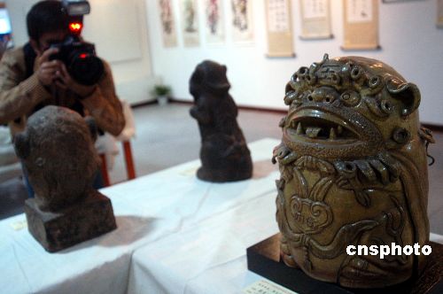 十一月二十八,在福建泉州市华侨历史博物馆举行了两岸书画、陶艺作品展,金门艺术家创作的《有求必应风狮爷》尤为吸引观众。上午,为庆祝泉州市金门同胞联谊会成立二十周年,一百多位两岸艺术家们以文会友,共同欣赏了百余件书画、陶艺作品,来自金门的艺术家们带来了自己的书画、陶艺作品,与泉州的艺术家们交流创作。中新社发 傅丹丹 摄