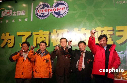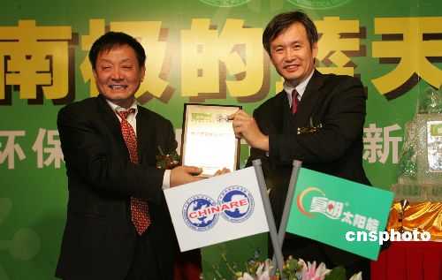 十二月二日,中国国家海洋局极地考察办公室与皇明太阳能集团在北京举行合作签约仪式,共同就“南极环保与太阳能极地应用”展开深度合作。据悉,皇明太阳能热水器在南极的应用,不仅可以解决考察队员生活用热水问题,更主要的是它不依赖任何常规能源,不会产生影响南极环境的污染物,对南极环保可以做出实质性的贡献。中新社发 武仲林 摄