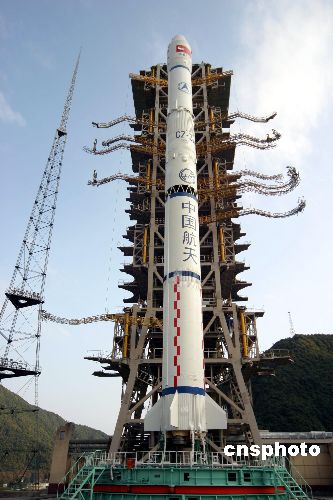十二月八日,中国在西昌卫星发射中心用“长征三号甲”运载火箭,成功将“风云二号”D气象卫星送入预定轨道。图为星箭组合体发射前倚天而立、直指苍穹。中新社发 胡建兵 摄