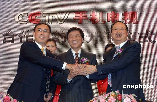 十二月十一日,中央电视台联手中国移动、中国联通两大移动通讯运营商签约、启动CCTV手机电视业务,CCTV电视节目将通过移动网络传输方式向大众传播,并提供直播、点播、下载等个性服务。来自中宣部、国家广电总局、信息产业部与中央电视台、中国移动、中国联通的嘉宾共同祝贺手机电视正式开通。据统计,中国手机用户已达四点四三亿,随着手机的业务形态和功能的不断拓展,特别是与互联网、广播电视的结合,使手机发展成为多媒体的信息终端成为可能。中新社发 张宇 摄