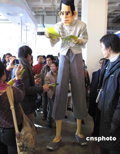二○○七年一月十一日,为期四天的“2007北京图书订货会”正在北京中国国际展览中心举行。国内数以万计的图书销售商及图书馆单位前往洽购图书。此次展会参展单位共有近七百家,包括港、澳、台出版机构一百三十三家,展位接近两千个。图为成都电视台少儿剧团公关人员,拌作巨人卡通木偶,派发中国第一部卡通偶形品质舞台大剧--《巨人的城堡》节目单,这部舞台剧十六日起将在北京保利剧院演出。中新社发 邹宪 摄