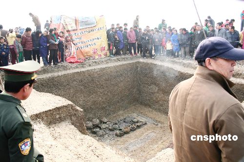 由于宁西铁路线建设需要,安徽合肥肥东石塘镇龙城居委会野外的龙城古墓群遗址在进行抢救性挖掘。1月19日、20日两天,当地发掘出土战国和西汉时的大量文物,据悉,其中战国古墓被专家初步认定为战国武官墓。中新社发 张魁 摄