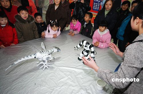 2月10日,重庆市福利院孤残儿童正在少年宫参观会在水中遨游的机器鱼。当日,中国智能机器人暨青少年科普知识巡展在重庆市少年宫开展。市儿童福利院35名孤残儿童在“妈妈”的带领下,首批进场参观国内一流的中国智能机器人精彩表演,让孩子们体验、感受科技的魅力。中新社发 重庆钟桂林 摄