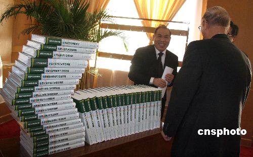 | 二月十一日,由中国科学院院长路甬祥担纲总主编完成的《中国可持续发展总纲(国家卷)》在北京首发。这是第一部全面总结中国可持续发展的大型学术论著和文化工程,由中国可持续发展领域一百八十四位资深专家和学者历时两年八个月共同完成,具有很高的权威性、学术性、文献性和典藏性。图为这套巨著的执行总主编、国务院参事、中科院可持续发展战略组首席科学家牛文元教授向来宾展示该套共二十卷的巨著。中新社发 孙自法 摄