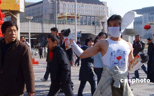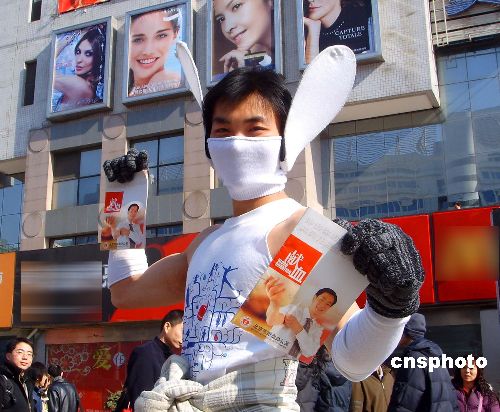 2月11日,一位在北京打工的广东籍青年在西单街头宣传义务献血,独特的装束吸引了人们的目光。中新社发 玉龙 摄