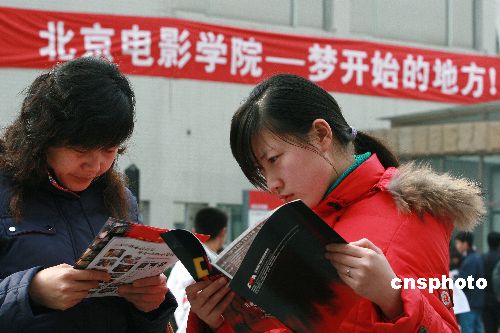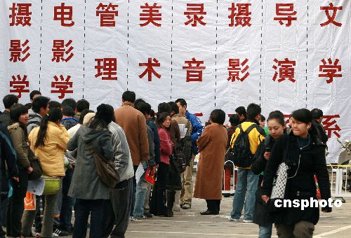 2月24日,北京电影学院2007年本科、高职招生工作全面启动。在报名的第一天,文学系、导演系、摄影系、美术系、摄影学院、表演学院开始接受报名。从各地赶来的、为圆电影梦的莘莘学子在校园内排起了长队。中新社发 鲁谷 摄
