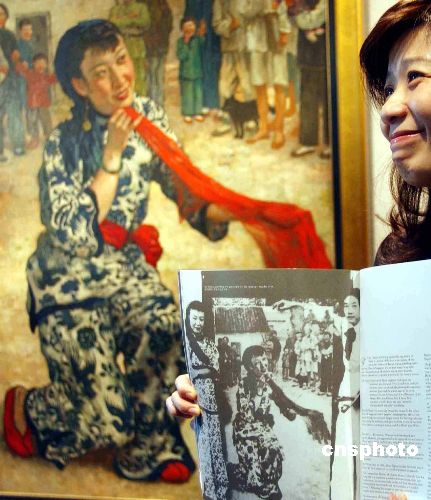 已故中国画坛大师徐悲鸿的名作“放下你的鞭子”,1日在香港举行的苏富比春季拍卖预展上向传媒展示,它的估价约3千万元,是香港历来估价最高之油画,也是徐悲鸿画作中,罕见的抗战写实题材,自1954年后首度公开曝光。中新社发 谭达明 摄