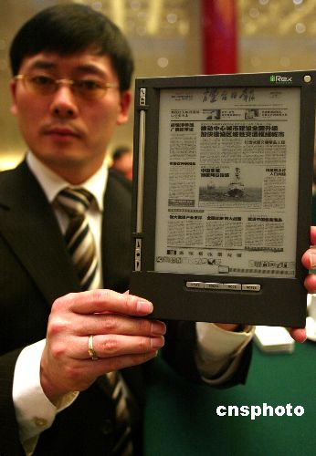 三月十日,iRex电子纸原创者荷兰籍华人周国富博士在北京召开的“电子纸信息技术产业化研讨会”上展示这种新型的媒介载体。iRex电子纸利用电泳显示技术原理发明而生,其所以被称之为“纸”,是因其作为纸张的替代品而被研发。目前,电子纸已经初具传统纸张的一些特性。中新社发 杜洋 摄