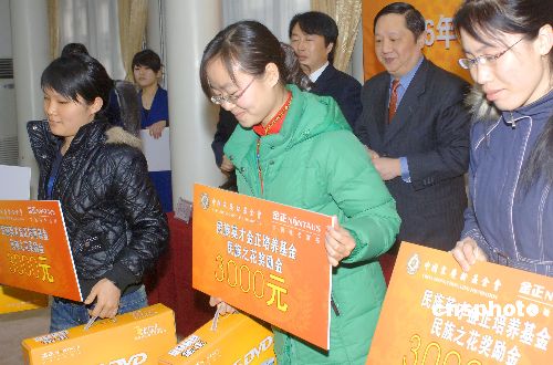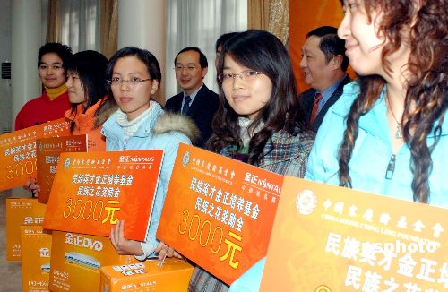 3月20日,“2006年(首届)民族英才金正培养基金颁奖仪式”在北京宋庆龄故居举行,代表56个民族、来自国内八所高校的141名女大学生,获得了中国宋庆龄基金会“民族英才金正培养基金”项目的奖励基金,每人3000元人民币及价值1000元的金正数码DVD产品。出资单位金正公司总裁田家俊、中国宋庆龄基金会秘书长李宁(后右一)等人为其颁奖。从2006年开始,该项基金每年在国内拟定学习成绩优异或具有文化、艺术类突出专长的民族优秀女大学生实施奖励,以期为民族大家庭培养出杰出民族英才。图为18名代表出席颁奖会。中新社发 邹宪 摄