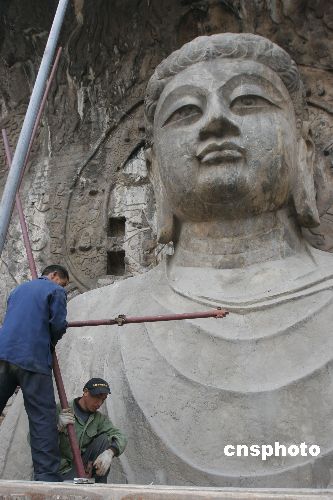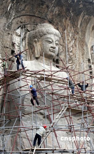 3月23日,工人们正在拆除卢舍那大佛前的脚手架。当日,龙门石窟最具典型的卢舍那大佛养护工作结束。这是卢舍那大佛1971年以来的首次系统养护工程,维修工人经过15天的紧张工作,为大佛表面除尘除污,封堵卢舍那大佛自身和周边2000余处细缝,使卢舍那大佛以更加靓丽的容貌呈现在游客面前。此次保护人员没有对大佛进行大的修复,只是对大佛进行除尘、除污、修填裂缝等措施的“美容”和“保养”。中新社发 张晓理 摄