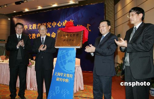 四月三日,中国首家地方华文教育研究中心——上海华文教育研究中心正式成立,国务院侨办副主任赵阳(左二)、上海市副市长唐登杰(右二)为该研究中心揭牌。该研究中心还对上海首批二十家“上海华文教育基地”进行了命名授牌。以“理论探索与实践创新”为主题的首届华文教育论坛同时举行。中新社发 潘索菲 摄