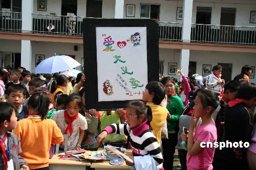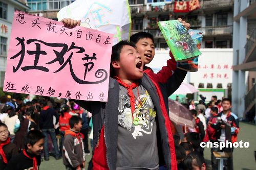 4月11日,浙江温岭横湖小学红领巾跳蚤市场开张营业。1800多名学生设立摊点,把自己用过的或多余的课外书、学习用品、生活用品和玩具等,以低价向同学抛售。据悉,交易所得8000多元钱将全部捐献给桐山小学和紫皋小学16位贫困学生。中新社发 周学军 摄