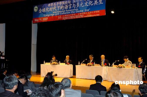 5月11日,在日本举行的首届世界孔子学院论坛举办题为“全球化时代下的语言与多元文化共生”的国际研讨会。图为中、日、美学者共同探讨各国的语言教育。中新社发 朱沿华 摄
