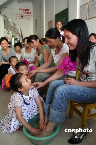 5月11日,江西省东乡县同欣幼儿园的小朋友在为妈妈洗脚。当日,该幼儿园开展“我和妈妈换个位,宝宝献礼谢妈妈”系列迎接母亲节活动,邀请部分小朋友的妈妈来到幼儿园参加亲子活动,小朋友们用为妈妈洗脚、喂饭等活动换位体验感受妈妈的辛苦,并用自己的行动表达对妈妈的爱,表达对母亲节日的祝福。中新社发 何江华 摄