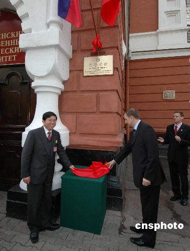 5月15日,俄罗斯阿穆尔州布拉戈维申斯克孔子学院揭牌仪式在俄布国立师范大学举行。中国驻哈巴罗夫斯克总领事范先荣代表国家对外汉语工作办公室与俄布国立师范大学尤利校长签署合作建设孔子学院的协议,并共同为孔子学院揭牌;范先荣、辛宝忠、黑河学院党委书记姜义男与俄阿州副州长斯捷潘诺夫、教育厅长拉宾斯基、尤利校长共同种下友谊树。中新社发 邱齐龙 摄