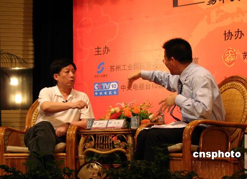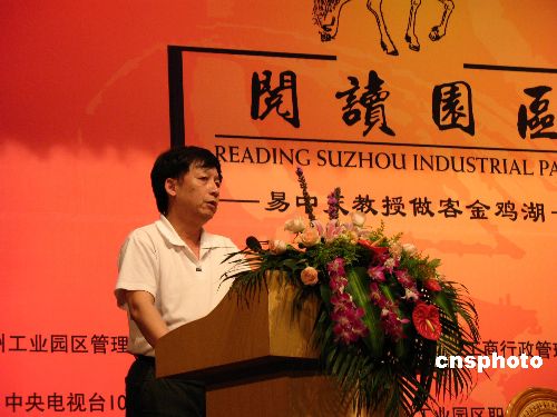 5月15日下午,厦门大学人文学院易中天教授作客苏州,在苏州工业园区职业技术学院作文化对白。在精辟的“阅读园区”开讲之后,易中天还和苏州的“意粉”进行了交流,风趣幽默的语言风格引来众人阵阵掌声。中新社发 温海兰 摄