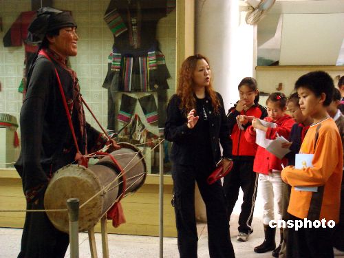 五月十八日,桂林博物馆的讲解员在广西少数民族民俗陈列室内,为桂林市西山小学的一百名小学生讲解盘瑶长鼓舞。五月十八日是第三十一个国际博物馆日,今年的主题是“博物馆和共同的遗产”。桂林博物馆当天免费向市民开放。中新社发 欧惠兰 摄
