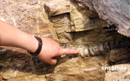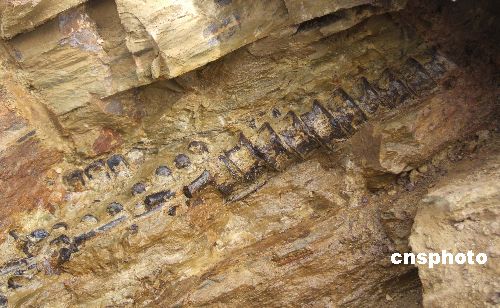| 5月20日,水生爬行动物化石。当月17日,重庆永川区灯坪村廖永胜兄弟在建房挖地基时,发现一具化石,廖氏兄弟当即上报永川区文物管理所。区文管所和重庆市自然博物馆的专家18日至20日在现场对暴露部分化石封存,开展试探性发掘工作。据专家初步鉴定,化石为距今一亿五千万年前的、恐龙同时代的水生爬行动物,它不属于恐龙,其保存情况不是很好。它的整个骨架被扰乱了,保存骨骼不关联,只有八个尾椎是连续的,其它尾椎全部散掉,所以在现场没有发现身子部分,也没有发现其他肢骨。中新社发 陈仕川 摄