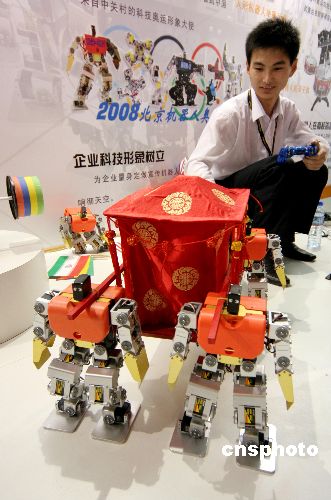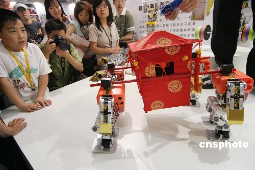 2007年5月25日,四个机器人抬着一顶大花轿,在工程师遥控下,它们抬着花轿卖力表演,把现场观众逗得哈哈大笑。为期一周的北京第十届科博会在北京国际展览中心举行。中新社发 吴芒子 摄