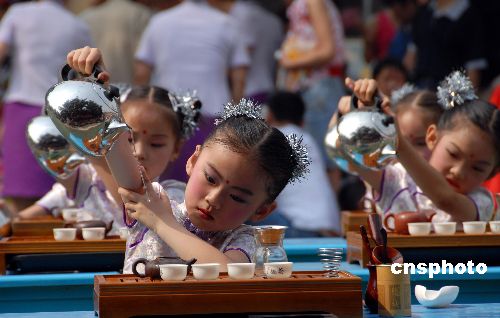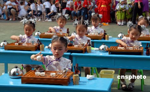 5月29日,河南省濮阳市中原油田基地第十三幼儿园的孩子们,在迎“六一”联欢会上,进行了传统茶艺文化节目表演。目前,这个油田8所幼儿园共同承担了国家礼仪品格教育课题,通过对中国古老文化的学习和了解,让孩子们学礼、知礼、懂礼、用礼。中新社发 胡庆明 摄