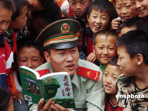 5月29日,武警宁夏吴忠市支队战士在为盐池县大水坑镇第一小学的孩子讲述武警忠诚卫士的战斗故事。“六一”前夕,武警宁夏总队吴忠市支队官兵来到宁夏盐池县大水坑镇第一小学,为贫困山区的孩子们送去乒乓球桌、书包等文体用品,鼓励学生好好学习、健康成长。中新社发 张波 摄