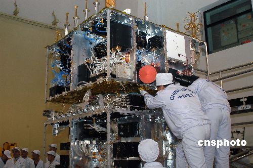 六月十四日,由中国和巴西合作研制的地球资源卫星02B星在北京完成相应准备工作,随即进入为期二十天左右的大型试验阶段,预计今年九月或十月发射。图为中巴科研人员在进入真空热试验等一系列重要大型试验前对卫星进行检查和调试。中新社发 索继安 摄