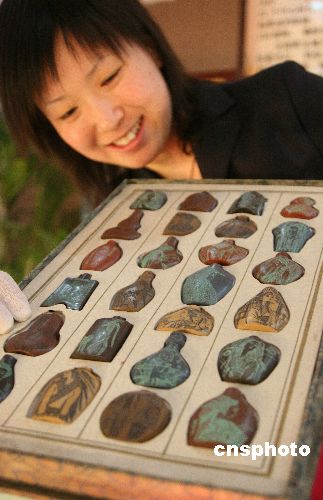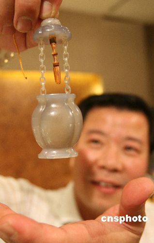 6月16日,京冀鲁三地鼻烟壶名家作品展在北京官园珠宝城当代艺术家长廊开幕,展品荟萃张广庆、张汝才、张增楼等中国工艺美术大师用白玉、翡翠、玛瑙、琥珀等雕刻而成的数十品种500多件鼻烟壶,总价值500万元。展览将于6月27日结束,观众可免费参观。中新社发 陈晓根 摄
