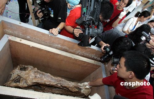 | 6月18日,中国国宝级珍品——“自贡恐龙”化石首次离开发掘地运抵上海,开始在中国内地巡展。图为首次巡展的“镇展之宝”和平永川龙头骨化石在上海科技馆开箱。据介绍,此番共有59箱珍贵的国宝级恐龙化石经3天3夜的武装安保押运顺利抵达上海。首站巡展将于今年7月10日在上海科技馆启幕,对社会大众免费开放,届时露面的还将有知名的马门溪龙皮肤化石以及8具恐龙骨架、18件恐龙中小型标本。中新社发 高尔强 摄